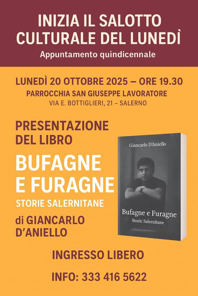 L’appuntamento inaugurale di lunedì 20 ottobre vedrà protagonista l’Avvocato Giancarlo D’Aniello, che presenterà il suo libro “Bufagne e Furfagne – Storie salernitane”. Attraverso le pagine del suo racconto, D’Aniello ripercorre la vita quotidiana della Salerno del Novecento, offrendo spunti di riflessione con un registro che promette di essere tanto profondo quanto venato di ironia.